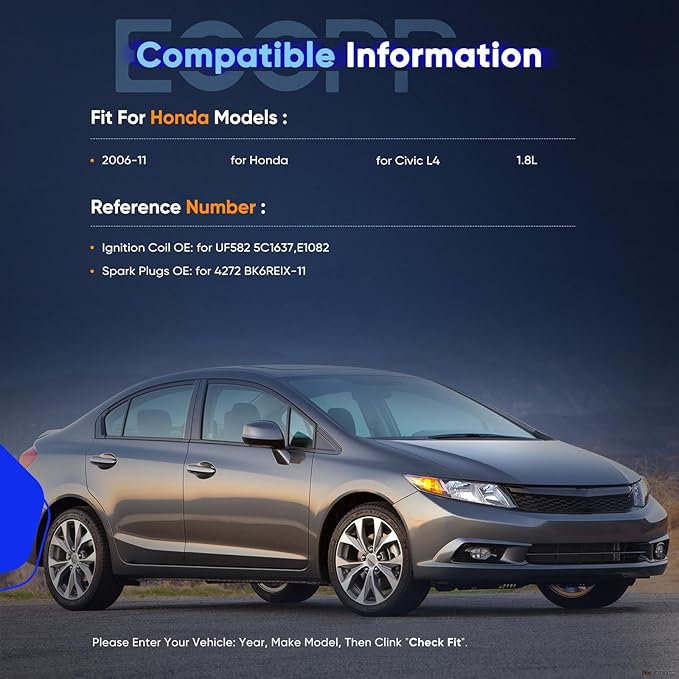 - [Vehicle Fitment]: Ignition Coil Packs Compatible for Honda for Civic 2006-2011 L4 1.8L Petrol