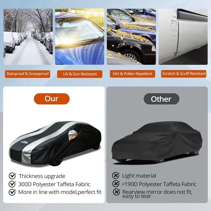 - All-Weather Protection: Shields your vehicle from snow, rain, frost, sun, dust, leaves, sap, bird droppings, and accidental scratches—keeping your car clean and protected in any environment