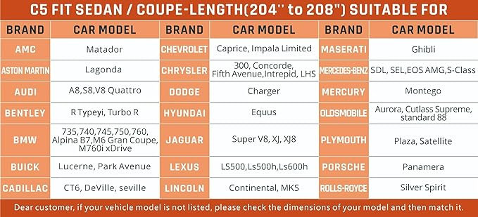 - Broad Compatibility for C5: Full exterior covers universal for Audi A8, Lexus LS500, Jaguar XJ,Benz S-Class etc.(SEE FIGURE 7 FOR MORE MODELS)
