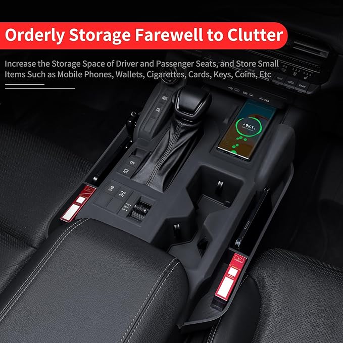 - 【Features】: The Data Production of the Original Car Makes the Product Fit Perfectly with the Vehicle, and the Reserved Hole Position Does Not Block Button Positions, and Does Not Affect the Charging of the Mobile Phone, Making More Effective Use of Space, increase the Storage Space of Driver and Passenger Seats, and Store Small Items Such as Mobile Phones, Wallets, Cigarettes, Cards, Keys, Coins, Etc. So That Your Vehicle Central Control Can Be Kept Clean and Tidy.