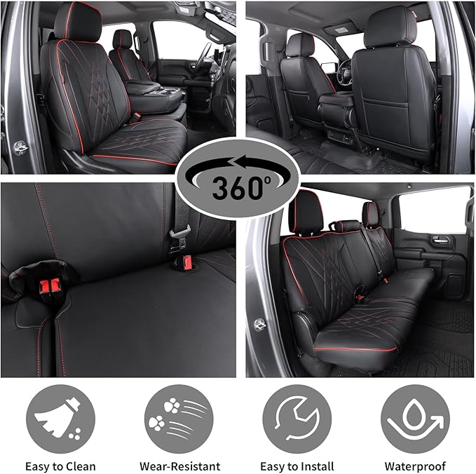 EKR Silverado Seat Covers Custom Fit for (Crew Cab) 2019-2026 Chevrolet Silverado 1500/1500 Limited/HD 2500/3500, Rear Row W/No Armrest,Faux Leather(Black with Red Trim)