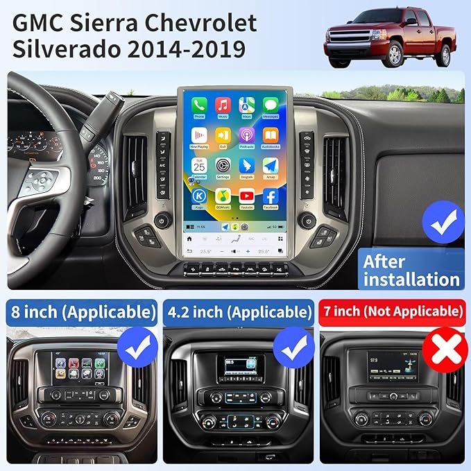 - 【Applicable Models】-This car radio is fit for Chevrolet Silverado GMC Sierra 2014-2019(Support OEM 4.2 and 8 inch ,don't support OEM 7 inch version). 100% standard size.Provide free installation tools for self-installation.