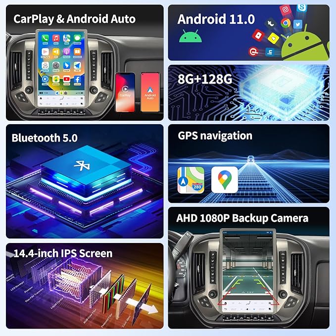 - 【High Configuration】-UPGRADED Android 11 system, 8 Core CPU+8GB RAM+128GB ROM enhance fluency. With a 1280*720 resolution, it offers a super crisp display. Supports snappy and responsive for a smooth user experience. The plug-and-play GMC Sierra Silverado radio.