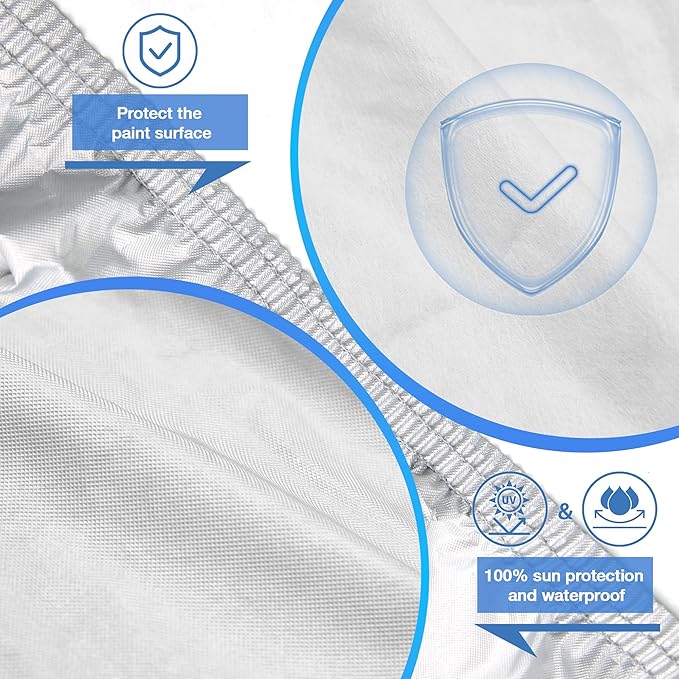 - [High-Quality Materials] - This breathable car cover is made of 6 upgraded materials. The first layer is a waterproof coating that provides 100% waterproof effect. The second layer is made of PE, which can keep the temperature inside the car. The third layer is aluminum foil, which can reflect 99% of ultraviolet rays and reduce ultraviolet damage. The fourth and fifth layers are made of PEVA material, which has a very strong tear resistance. The sixth layer is soft cotton material that can effectively protect the car's paint.