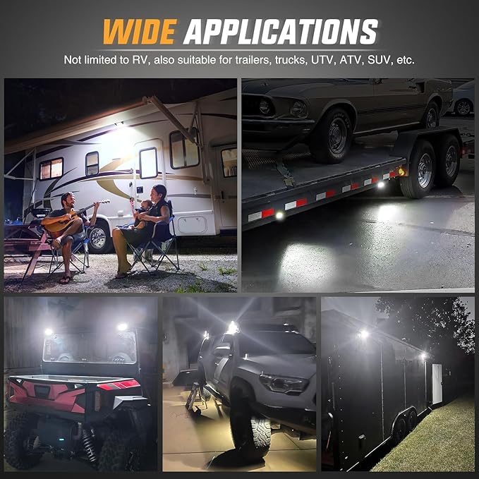 - Wide Application: Fits all 12V, and 24V vehicles, especially RVs, campers, and travel trailers, also suitable for toy haulers, tractor-trailers, cabinets, campers, motorhomes, marine boats, SUV roof racks, fire truck, and can even be mounted to the undercarriage of your vehicle, RV outside lights, RV porch light, food truck lights, roof rack lights, led scene light and cargo trailer lights, etc