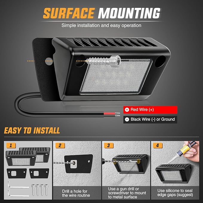 - Easy Installation: Pre-drill a hole for the wiring harness in the area you have selected, then use a gun drill to secure the lights with self-tapping screws. Hard-wire the harness to power the lights (Recommend to use 16AWG wiring harness)