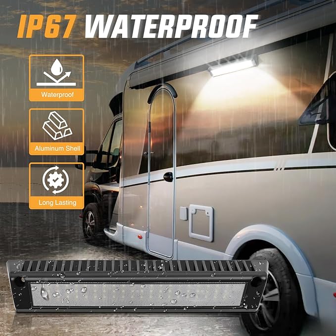 - Wide Application: Fits all 12V, and 24V vehicles, especially RVs, campers, and travel trailers, also suitable for toy haulers, tractor-trailers, cabinets, campers, motorhomes, marine boats, SUV roof racks, fire truck, and can even be mounted to the undercarriage of your vehicle, RV outside lights, RV porch light, food truck lights, roof rack lights, led scene light and cargo trailer lights, etc