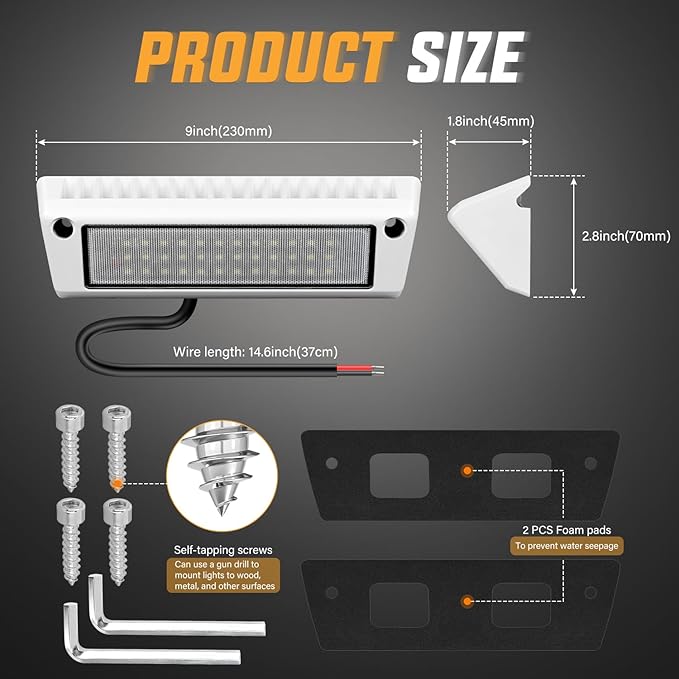 - Wide Application: Fits all 12V, and 24V vehicles, especially RVs, campers, and travel trailers, also suitable for toy haulers, tractor-trailers, cabinets, campers, motorhomes, marine boats, SUV roof racks, fire truck, and can even be mounted to the undercarriage of your vehicle, RV outside lights, RV porch light, food truck lights, roof rack lights, led scene light and cargo trailer lights, etc
