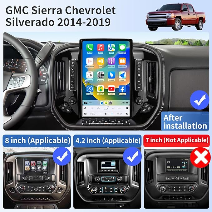 - 【Applicable Models】-This car radio is fit for Chevrolet Silverado GMC Sierra 2014-2019(Support OEM 4.2 inch and 8 inch version, don't support OEM 7 inch). 100% standard size.Provide free installation tools for self-installation.