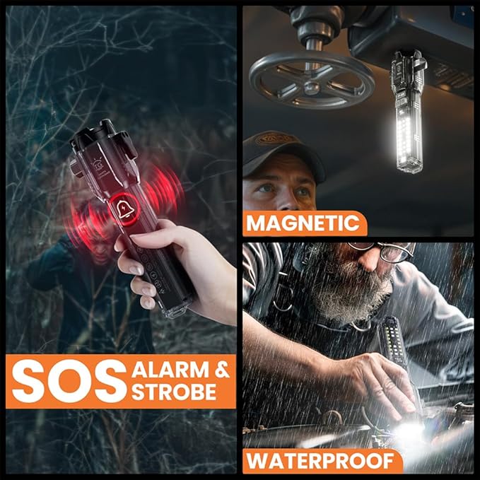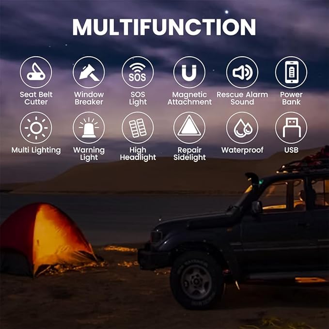 - [Emergency Rescue Alarm Light & Buzzer] Long press the side light button to instantly activate the red strobe light and high-decibel siren - essential for roadside emergencies, signaling an SOS, or deterring threats. The strobe light increases visibility in dark conditions, while the piercing siren alerts rescue teams or passing vehicles. Long press the side light button to safely turn off.