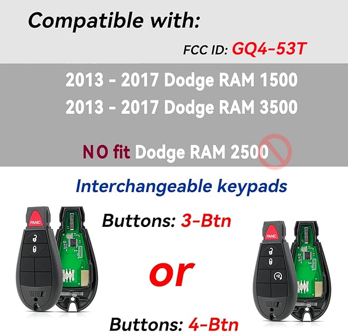 - FCC ID: GQ4-53T, This remote key fob replacement is compatible with 2013 2014 2015 2016 2017 RAM 1500 3500 key fob with tool and Interchangeable 3 and 4 Button Key pads.for Simple Key RAM 1500.