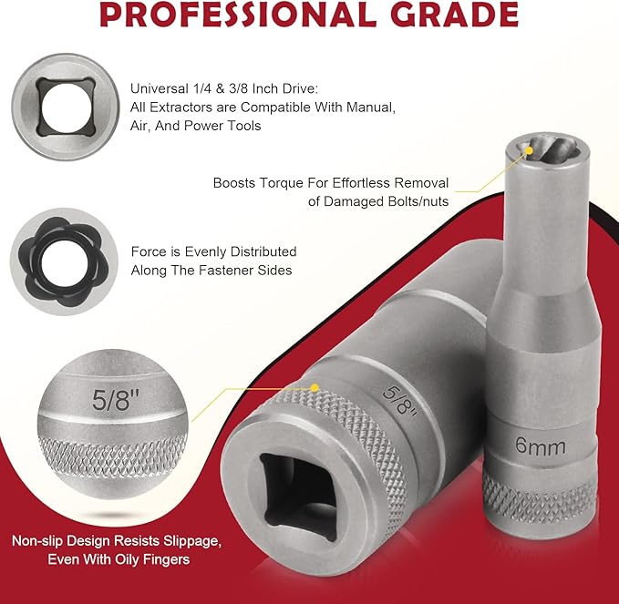 - ๐ ๏ธ Dual-Drive Dominance for Pros & DIYers! Unlike single-drive competitors, this easy out screw extractor set works flawlessly with both 1/4" & 3/8" tools. Includes knock-out pin & hex adapters - your ultimate solution from garage projects to professional repairs.