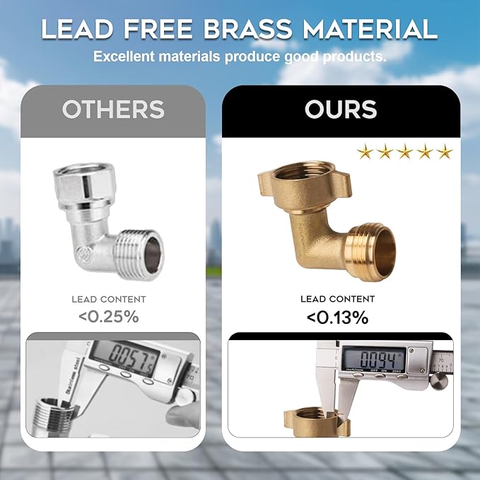 - 【Lead-Free Brass】Garden Hose 90 Degree Elbow: With a lead content of only 0.13%, well under the NSF lead free requirement of 0.25%, the elbow is safe to use for drinking water