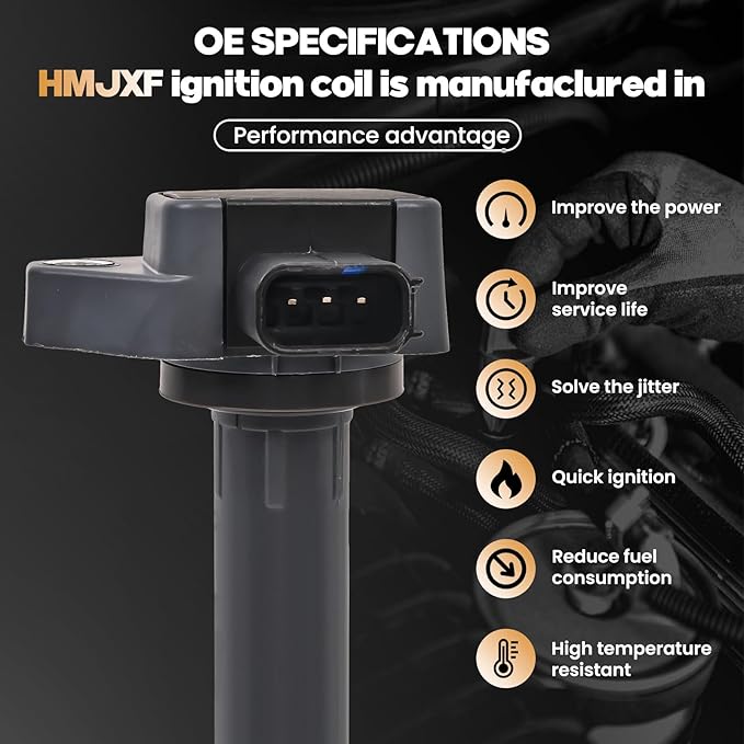 - [OE STANDARD]: All of the HMJXF Ignition Coils are purpose-built for both original equipment and replacement applications. Each component undergoes meticulous craftsmanship to match and improve upon the OE design, ensuring effortless installation. These coils deliver exceptional performance and reliability, operating flawlessly in all conditions and across the entire engine speed range. They guarantee optimal spark performance for your engine.