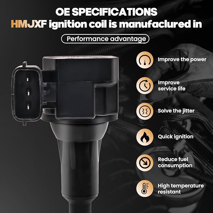 - [OE STANDARD]: All of the HMJXF Ignition Coils are purpose-built for both original equipment and replacement applications. Each component undergoes meticulous craftsmanship to match and improve upon the OE design, ensuring effortless installation. These coils deliver exceptional performance and reliability, operating flawlessly in all conditions and across the entire engine speed range. They guarantee optimal spark performance for your engine.