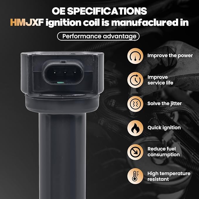 - [OE STANDARD]: All of the HMJXF Ignition Coils are purpose-built for both original equipment and replacement applications. Each component undergoes meticulous craftsmanship to match and improve upon the OE design, ensuring effortless installation. These coils deliver exceptional performance and reliability, operating flawlessly in all conditions and across the entire engine speed range. They guarantee optimal spark performance for your engine.
