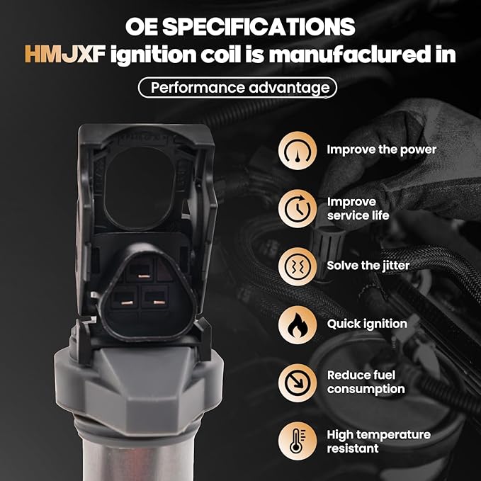 - [OE STANDARD]: All of the HMJXF Ignition Coils are purpose-built for both original equipment and replacement applications. Each component undergoes meticulous craftsmanship to match and improve upon the OE design, ensuring effortless installation. These coils deliver exceptional performance and reliability, operating flawlessly in all conditions and across the entire engine speed range. They guarantee optimal spark performance for your engine.