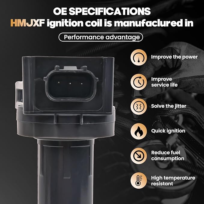 - [OE STANDARD]: All of the HMJXF Ignition Coils are purpose-built for both original equipment and replacement applications. Each component undergoes meticulous craftsmanship to match and improve upon the OE design, ensuring effortless installation. These coils deliver exceptional performance and reliability, operating flawlessly in all conditions and across the entire engine speed range. They guarantee optimal spark performance for your engine.