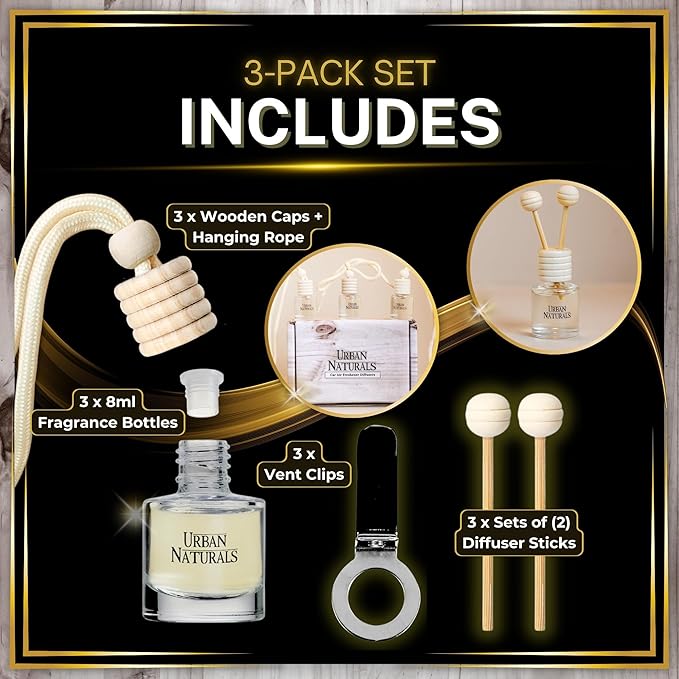 Urban Naturals Car Air Freshener Diffuser 3 Pack - Citrus Bliss Scent, 45+ Days Long Lasting Fragrance, Made in USA, Glass & Wood, Hanging Design + Vent Cip, Easy to Use