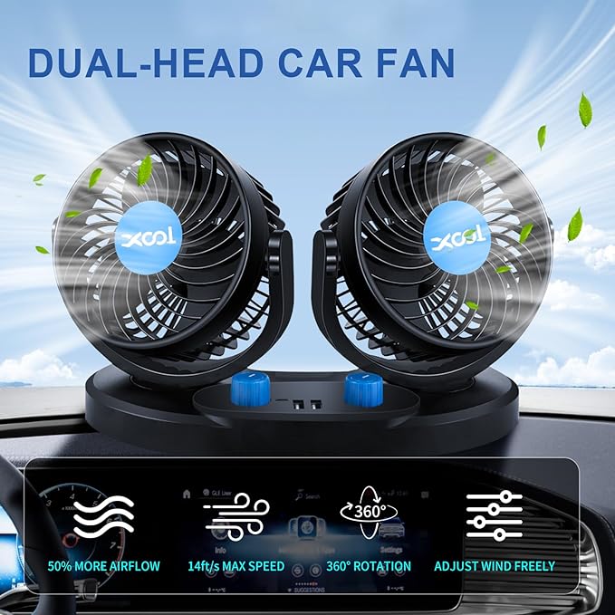 XOOL 12V Car Fan, 360 Degree Rotatable Electric Car Fans, 2 Speed Dual Head Fans with 2 USB Charging Ports, Quiet Strong Cooling Air Fan for Truck Vehicle Boat Van SUV RV