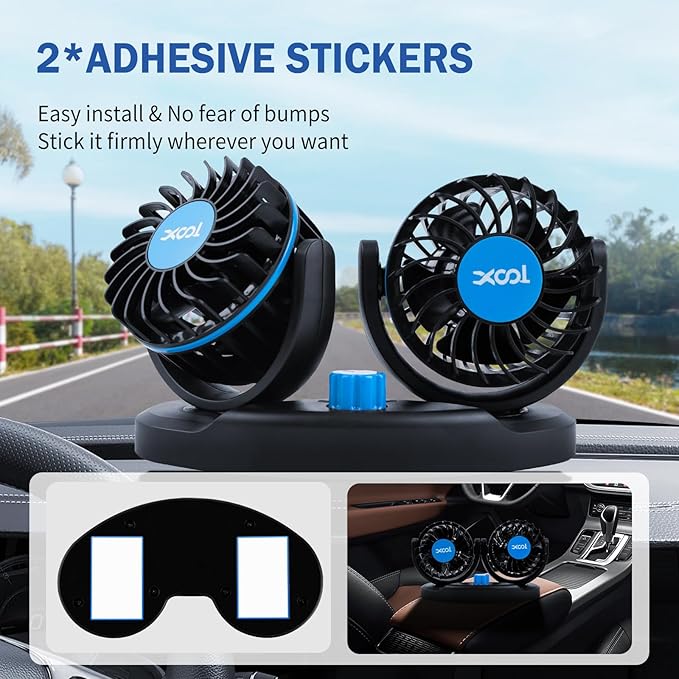 - Efficient Cooling Car Fan - XOOL Dual Head Front Seat Car Fan uses high-quality ABS material and 5-blade vortex wind gathering technology to delivers powerful, focused airflow to beat the heat fast. The fan is also equipped with a brushless motor no buzzing or distractions. Enjoy cool breezes. It is the best choice for cooling the car in the hot summer!