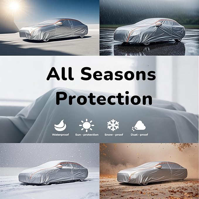 - 【All-Weather Defense】Crafted from premium PE & PEVA materials,this car cover provides excellent protection in all climatic conditions. featuring: - Waterproof: The outer layer is coated with a high-density waterproof film, which can withstand rain and snow. - Heat-resistant and UV-resistant: It can block strong sunlight, keep the interior cool, and reduce the damage of sunlight to the paint and interior. - Gentle paint protection: The soft cotton lining can reduce scratches and wear.