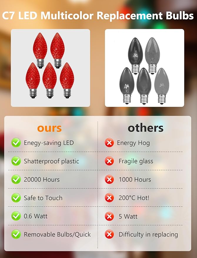 - E12 Base Bulbs Fits Most String Lights: C7 replacement bulbs with standard C7 or E12 candelabra base is compatible with most string light sets, lamps, and fixtures. so you can easily replace broken bulbs or upgrading your christmas lighting, keep your christmas decorations shining bright all season long. The perfect combination of vibrant hues to create a warm atmosphere in your yard, porch, or party space.