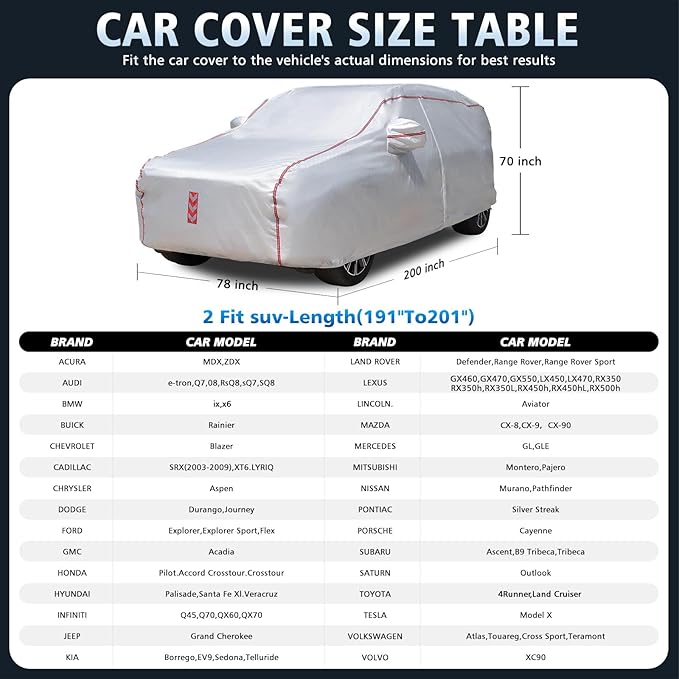 - ABOUT CAR COVER SIZE: please measure the length of your SUV (191"-200") before ordering universal fit for most sedan, car cover waterproof all weather protects from sun, rain and dust, comes with free storage bag for car cover