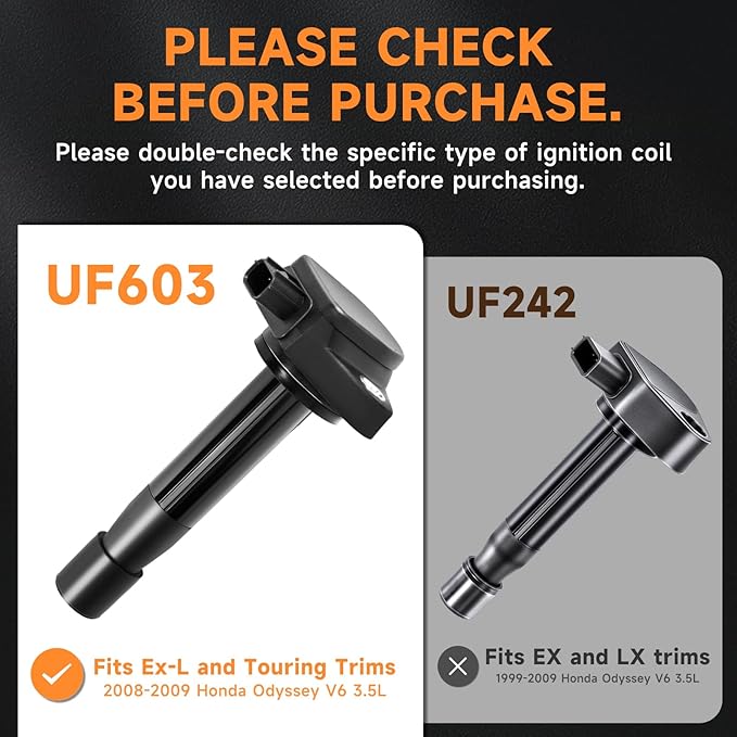 - [Vehicle Fitment-1]: Ignition Coil Pack Direct Compatible with Honda: Accord 2008-2012 3.5L V6丨Odyssey 2008-2017 3.5L V6 (2008-2010 Only fit for EX-L and Touring Submodel)丨Crosstour 2012 3.5L V6丨Accord Crosstour 2010-2011 3.5L V6 - Perfectly matches with OEM connectors for guaranteed fit.