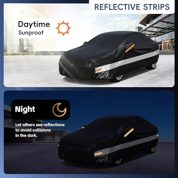 - 【Product Details】 -1.The Holthly car cover features three pairs of reinforced windproof straps to keep it securely in place, even in high winds.2.A spacious storage bag is included for easy folding and transport in your trunk.3.Double stitching along the edges ensures greater durability.4.Four reflective strips are added to enhance visibility and help prevent accidental collisions at night.