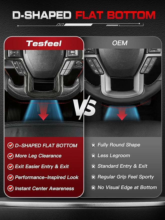 - 【Ergonomic D-Shaped Design】The D-shaped flat-bottom steering wheel improves legroom and driving posture. Contoured grip areas and lightweight construction reduce fatigue, making long drives more comfortable and enhancing steering control.