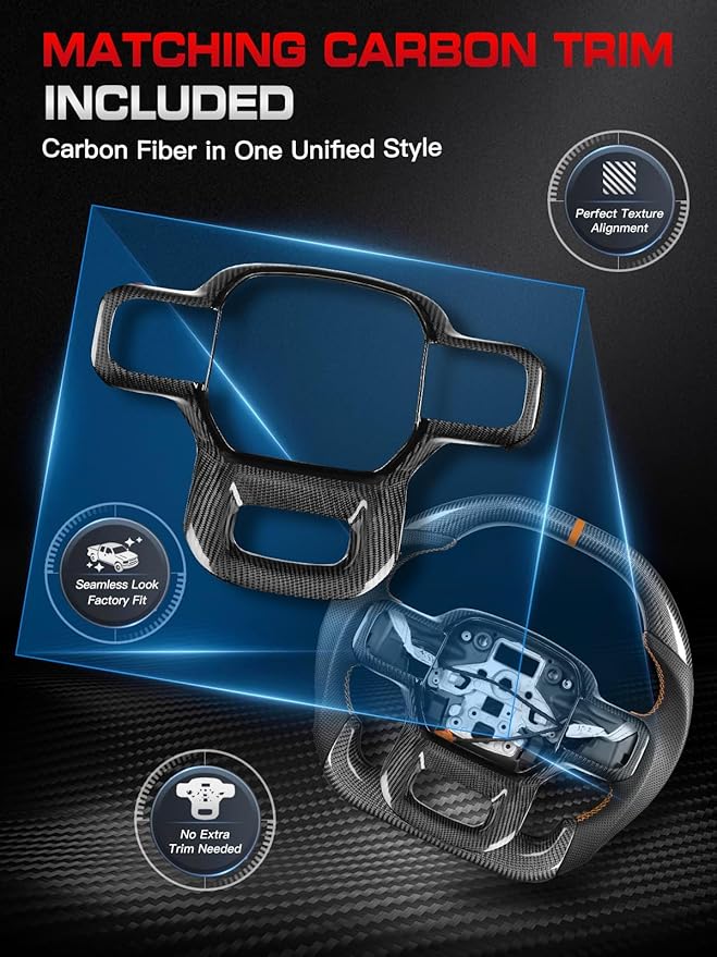 - 【Real Carbon Fiber Accent Trim Included】Includes a matching real carbon fiber accent piece, designed to align perfectly with the steering wheel for a seamless, premium look. The unified weave and glossy finish create a consistent style upgrade without the need for separate trim purchases.