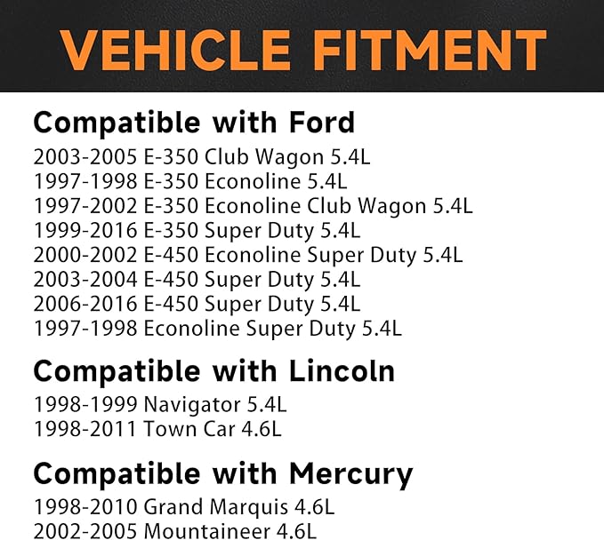 - Compatibility: Compatible with Ford E-350 Econoline 5.4L 1997-1998, E-350 Super Duty 5.4L 1999-2016, F-150 Heritage 4.6L/5.4L 2004, F-250/F-350 Super Duty 5.4L 1999-2004, Compatible with Lincoln 1998-1999 Navigator 5.4L, 1998-2011 Town Car 4.6L, Compatible with Mercury 1998-2010 Grand Marquis 4.6L, 2002-2005 Mountaineer 4.6L