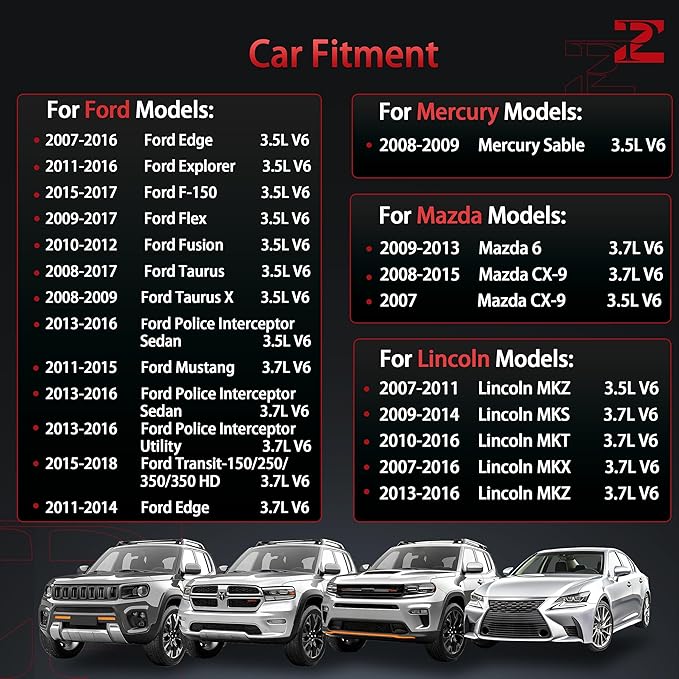 - Vehicle Fitment - Compatible with Lincoln Models: 2007-2011 Lincoln MKZ 3.5L V6/ 2009-2014 Lincoln MKS 3.7L V6/ 2010-2016 Lincoln MKT 3.7L V6/ 2007-2016 Lincoln MKX 3.7L V6/ 2013-2016 Lincoln MKZ 3.7L V6 || Compatible with Mazda Models: 2009-2013 Mazda 6 3.7L V6/ 2008-2015 Mazda CX-9 3.7L V6/ 2007 Mazda CX-9 3.5L V6 || Compatible with Mercury Models: 2008-2009 Mercury Sable 3.5L V6