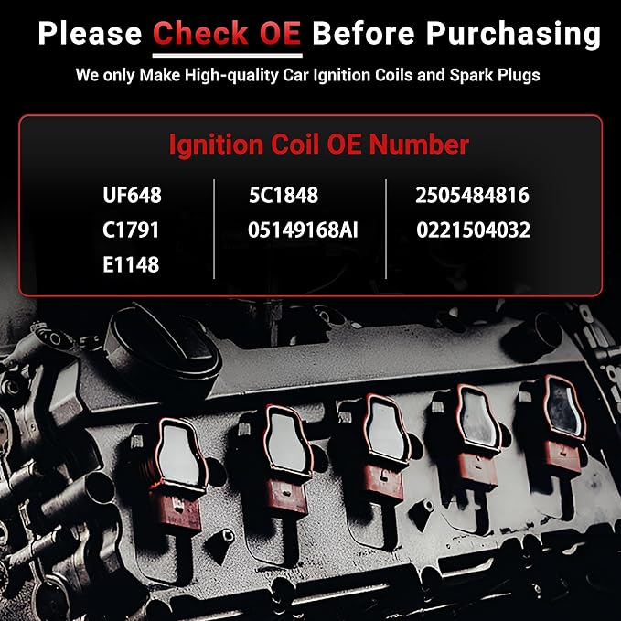 - Replace Part Number - Please check the Compatible chart of the listing to make sure the spark plugs and coil packs kit fit for your car.Ignition Coil:UF648, C1791, 5C1848, E1148, 05149168AI, 2505484816, 0221504032