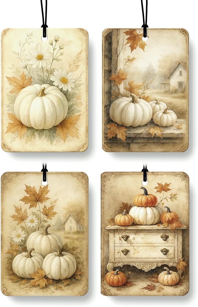 Vintage Fall Pumpkin Car Air Freshener 4 Pcs, Rustic Farmhouse White Pumpkins Flower Hanging Air Freshener for Cars Closet Drawer Books, Retro Fall Car Accessories Mirror Decor for Women