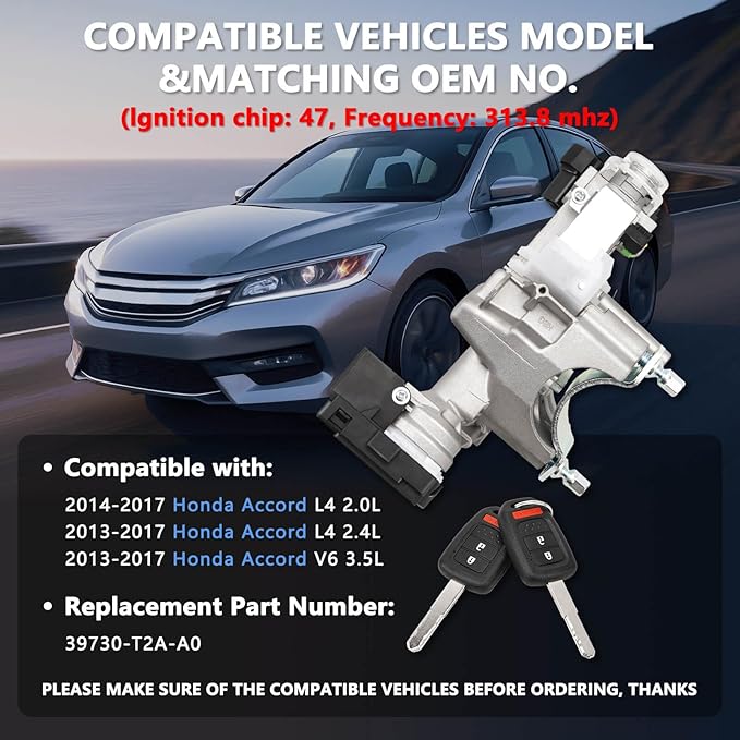 - 【Replacement OE No.】This ignition switch lock cylinder assembly OE part number:39730-T2A-A0, PLEASE MAKE SURE OF THE COMPATIBLE VEHICLES BEFORE ORDERING, THANKS 【Attention】The ignition switch lock with chip remote control needs to be programmed and matched decoded before it can work properly.Non-professional or no technical support staff please do not buy