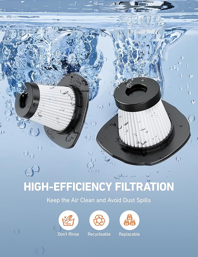 - MULTIPLE ACCESSORIES FOR DUST REMOVAL: Delivers up to 8kPa of suction with a washable HEPA filter (includes two extra filters), a 0.56L detachable dust cup, and four nozzles (flat nozzle, brush nozzle, extended hose, and a pet grooming brush) to reach tight corners and crevices for professional-level car cleaning. Note: Ensure the vacuum and filter are clean, and the filter is completely dry to optimize suction. Do not vacuum liquids or rinse the machine with water, as this may cause damage