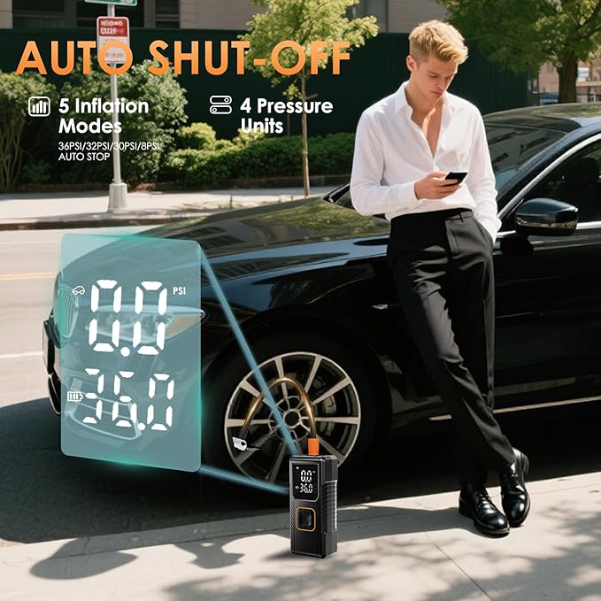 - Easy To Use & Auto Shut-Off: This air compressor car tire inflator features a one-button design for easy operation. It comes with four preset inflation modes and a custom mode, and a large digital display allows you to clearly view tire pressure at a glance. Additionally, after setting a target value, the inflator will automatically stop when the target pressure is reached, preventing the danger of overinflation and eliminating the hassle.