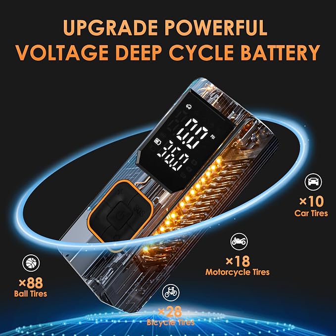 - Multiple Accessorie - Lasting Pro Kit: An essential travel tool, the inflator comes with a convenient storage bag that can be easily placed in your car, bike rack, or backpack. All-in-one Package List: portable tire compressor x1, air hose x1, schrader/presta valves x1, ball and swim ring needle x1, USB A-C cable(recharging itself), 11ft DC car cable x1, storage bag x1 and User Manual. Its high practicality and beautiful appearance also make it a unique gift for family and friends.If you have any questions or concerns, please feel free to contact us.