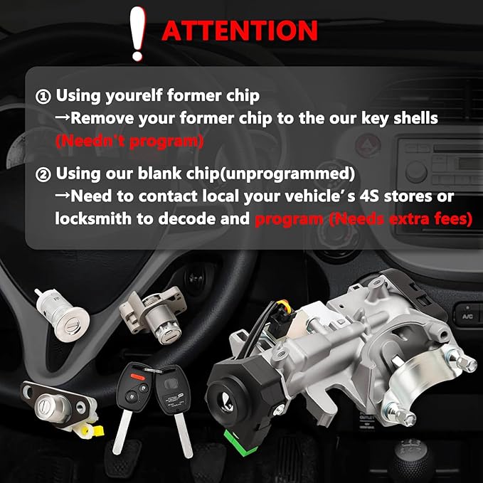 - PLEASE MAKE SURE OF THE COMPATIBLE VEHICLES BEFORE ORDERING, THANKS 【Attention】The ignition switch lock with chip remote control needs to be programmed and matched decoded before it can work properly.Non-professional or no technical support staff please do not buy