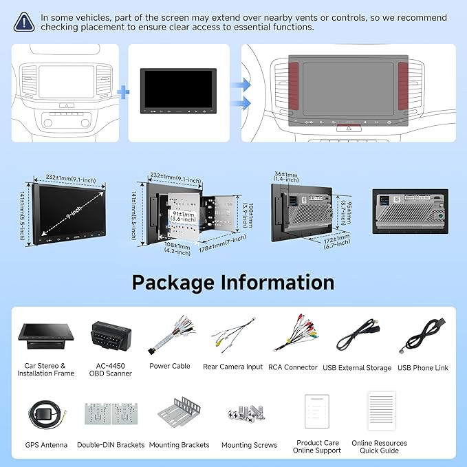 - Special Feature : 24-Bands EQ&DSP, Wi-Fi/Bluetooth/USB, 9 Inch IPS 1280*720P Touchscreen, Android System, 2G RAM and 32G ROM, Equipped with AC-4450 OBD II Scanners, Wireless CarPlay & Android Auto, Mirror Link 24-Bands EQ&DSP, Wi-Fi/Bluetooth/USB, 9 Inch IPS 1280*720P Touchscreen, Android System, 2G RAM and 32G ROM, Equipped with AC-4450 OBD II Scanners, Wireless CarPlay & Android Auto, Mirror Link