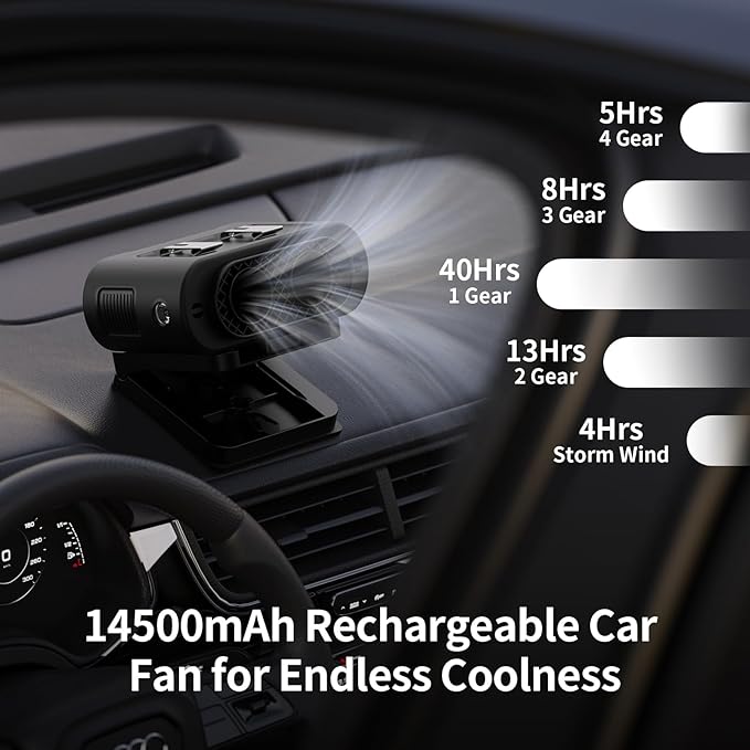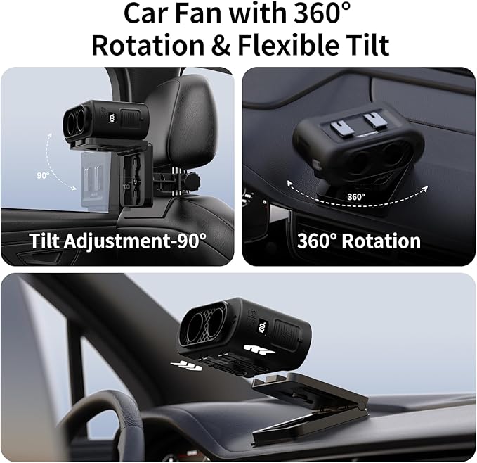 - 【Multi-Angle & Sturdy Metal Clip】Portable car fan features a sturdy metal clip that attaches securely to the car seat headrest and provides 360° rotation and 90° vertical tilt for powerful airflow in all directions. Ideal for car cooling, removing moisture from the windshield, and removing odors while ensuring fresh air