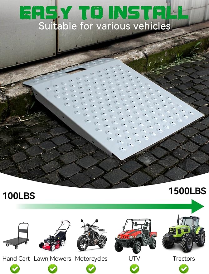 - Non-Slip Surface: The shed ramp for riding mower features a punched anti-slip design. Unlike smooth ramps that are slippery when exposed to water, these tiny holes drain away rainwater, snowwater, and mud in seconds, allowing you to always maintain a grip when moving your lawn mower, ATV, or cart.