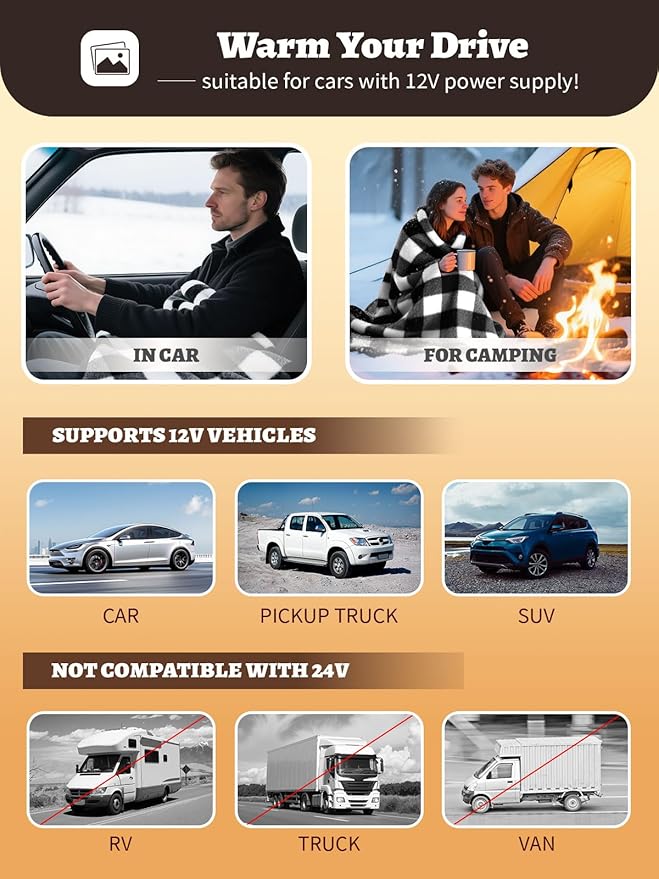 - A Great Gift:This electric blanket for car is an essential car stuff for winter travel and a perfect gift to express care during holidays such as Christmas and Thanksgiving. Whether for commuting, traveling, or camping, it allows your family or friends to feel this warmth and care during every winter journey