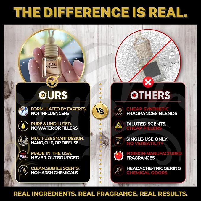 - 【Proudly Made in the USA】 Proudly crafted in the USA using thick glass and natural wood, this oil-based car air freshener provides car fresheners long lasting performance without chemicals. A smart alternative to an air freshener plug in or air freshener spray, it works as a powerful odor absorber and air fresheners for home odor eliminator. Perfect for car accessories for men and car air freshener for women who prefer a clean, new car smell air freshener without the artificial scent.