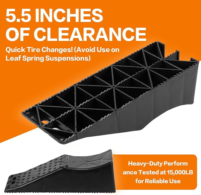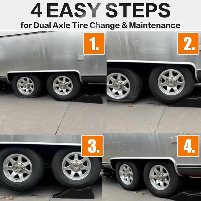 - Effortless Tire Changes: The Tlaleikejia Tandem Wheel Ramp transforms your tandem dual axle trailer tire changes into a hassle-free process. Drive onto the ramp to elevate your tire 5.5 inches, eliminating the need for traditional jacks