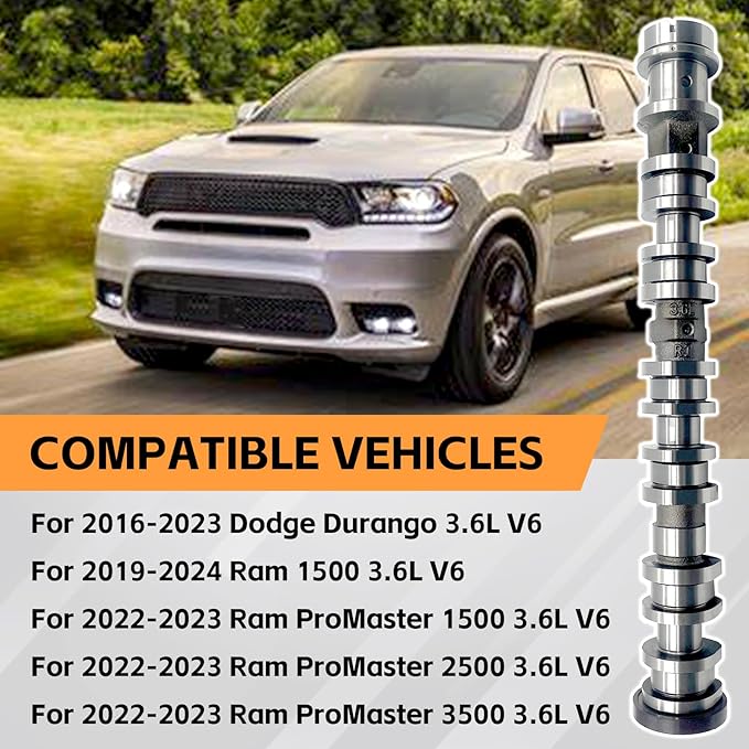 - FITMENT: 5047913AD right side intake camshaft for 2016-2023 Dodge Durango 3.6L V6, For 2019-2024 Ram 1500 3.6L V6, For 2022-2023 Ram ProMaster 1500 3.6L V6, For 2022-2023 Ram ProMaster 2500 3.6L V6, For 2022-2023 Ram ProMaster 3500 3.6L V6