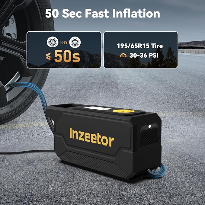 - 【50s Fast Inflation】: Equipped with Industrial-Leading chip, sensor and Zinc-Alloy motor, Inzeetor Tire Inflator takes only 50 seconds to inflate a tire (195/65R15) from 30 to 36 PSI.