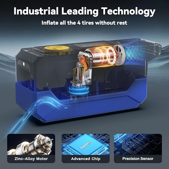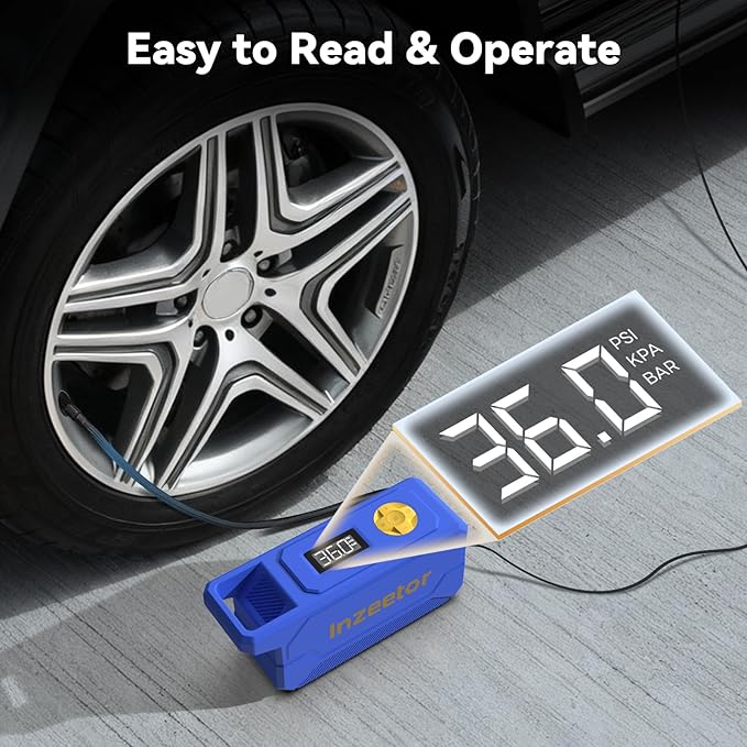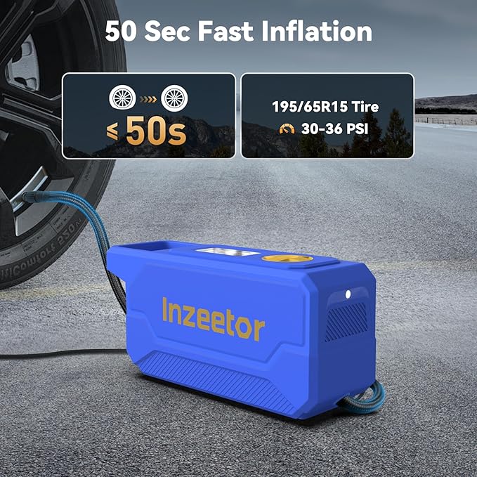 - 【50s Fast Inflation】: Equipped with Industrial-Leading chip, sensor and Zinc-Alloy motor, Inzeetor Tire Inflator takes only 50 seconds to inflate a tire (195/65R15) from 30 to 36 PSI.